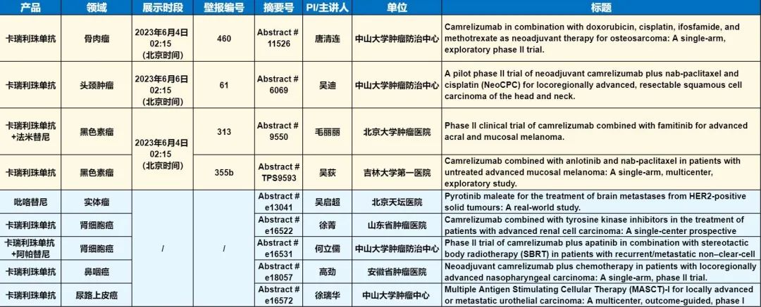 此外,在头颈肿瘤、黑色素瘤、骨肉瘤、鼻咽癌、肾细胞癌、尿路上皮癌等多个领域,卡瑞利珠单抗、吡咯替尼等产品相关研究一共入选了4项壁报展示和5项线上发表,彰显了AG亚游医药强大的自主研发综合实力。
